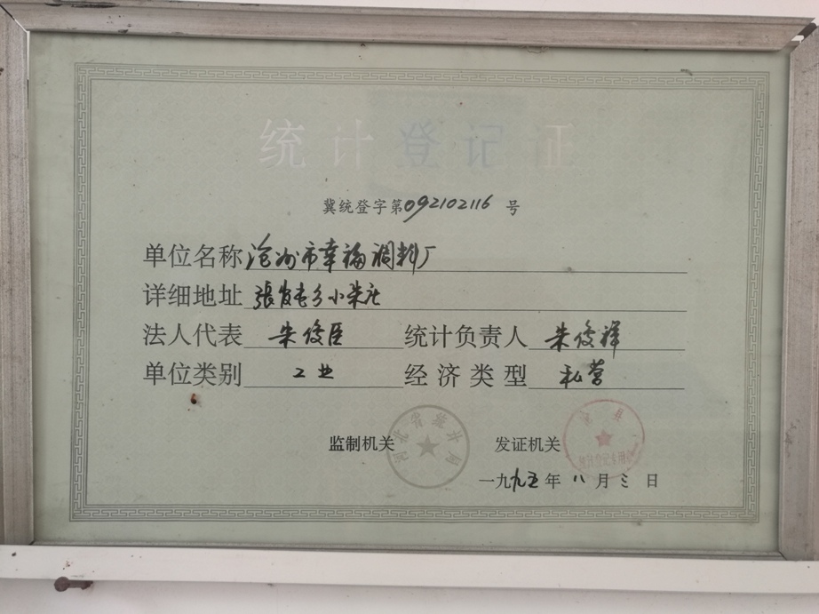 統(tǒng)計登記證 冀統(tǒng)登字第092102116號 單位名稱滄州市幸福調(diào)料廠 詳細地址張官屯鄉(xiāng)小朱莊 發(fā)證機關(guān):滄縣統(tǒng)計局 監(jiān)制機關(guān):河北省統(tǒng)計局 一九九五年八月三日